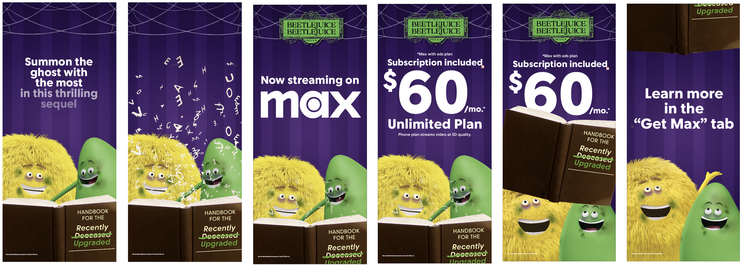 Utilizing assets provided by Warner Brothers, I was directed to storyboard a video that would live in the Cricket Explore experience within devices in-store that promoted the highly anticipated second Beetlejuice movie: Beetlejuice Beetlejuice. I was tasked to create something playful yet spooky that tied in elements from both Beetlejuice movies that brought in our own Cricket characters.
